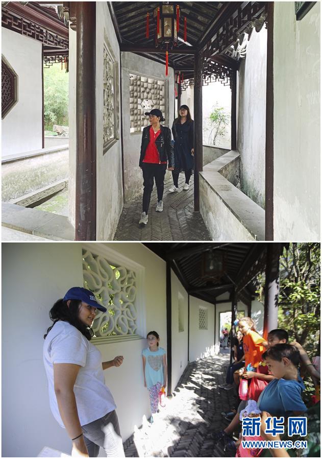 這張拼版照片展示的是:上圖,2019年4月2日,游客在中國蘇州留園內(nèi)游覽(新華社記者杜涓涓攝);下圖,2017年9月23日,在美國紐約寄興園舉行的迎中秋活動上,孩子們在志愿者的帶領(lǐng)下參觀(新華社記者王迎攝)。