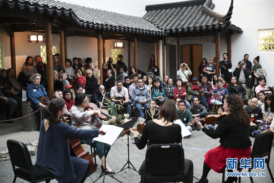 2018年2月24日,人們在美國紐約大都會博物館“明軒”欣賞演出,慶祝新春佳節(jié)。中式庭院“明軒”是中國第一個落戶海外的蘇式園林,位于美國紐約大都會博物館二層的玻璃天棚下,是模仿中國蘇州網(wǎng)師園中的“殿春簃”設(shè)計建造而成的?!懊鬈帯庇商K州市園林管理局承建,所用的磚、瓦、木材、構(gòu)件等在中國備好后,由20余名中國工程師和工匠在美國組裝。 新華社記者王迎攝