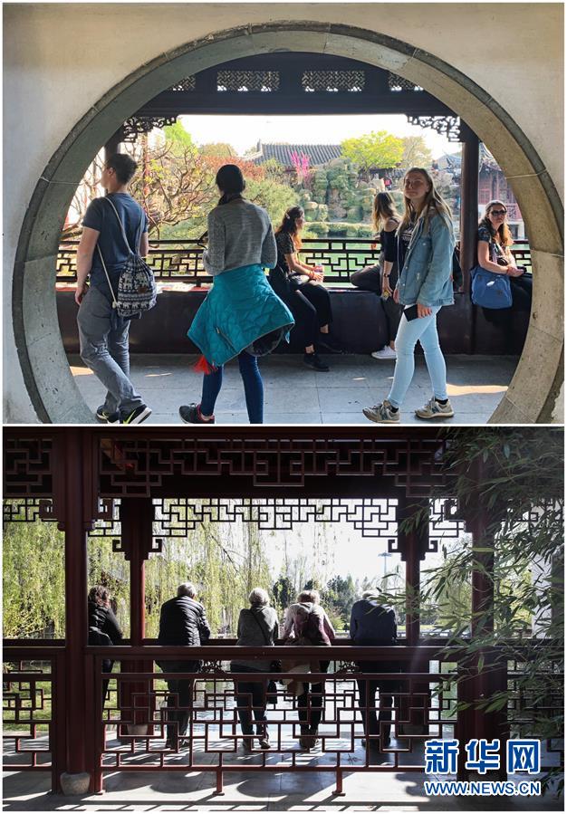 這張拼版照片展示的是:上圖,2019年4月1日,外籍游客在中國蘇州網(wǎng)師園內(nèi)游覽(新華社記者杜涓涓攝);下圖,2019年4月17日,游客在德國柏林中式園林“得月園”內(nèi)游覽(新華社記者單宇琦攝)。