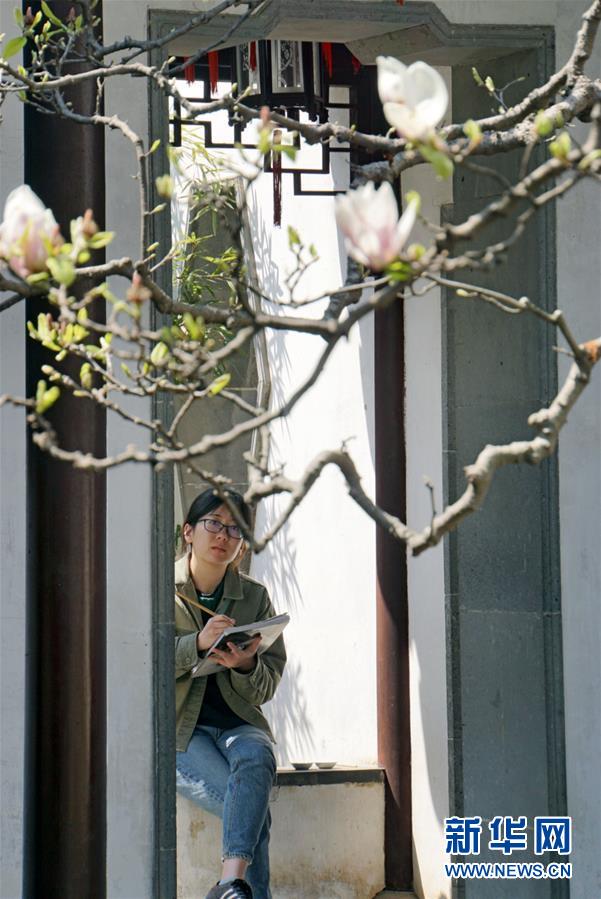 2019年4月1日,游客在中國蘇州網(wǎng)師園內(nèi)寫生。1997年,網(wǎng)師園和拙政園、留園、環(huán)秀山莊被列入聯(lián)合國教科文組織世界文化遺產(chǎn)名單。 新華社記者杜涓涓攝