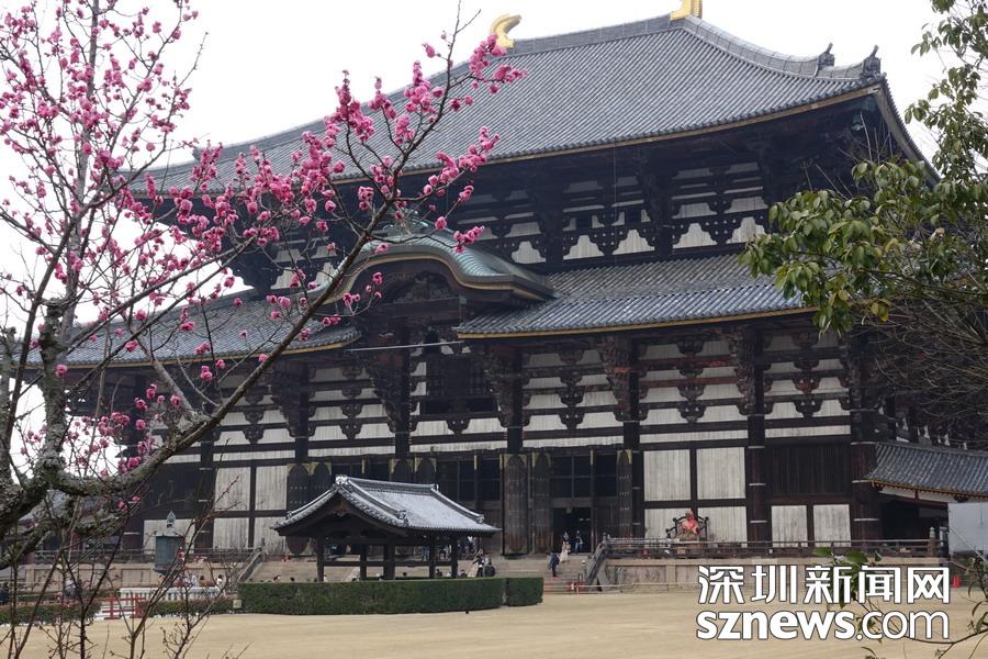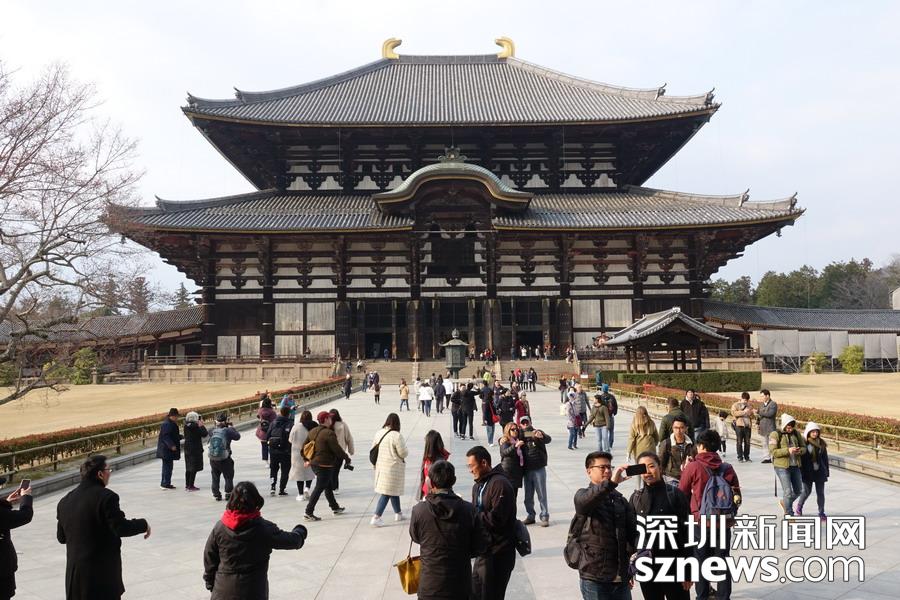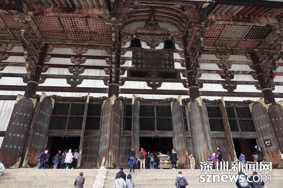 東大寺大佛殿正面寬度57米,深50米,為世界最大的木造建筑。殿內(nèi)放置著高15米以上的盧舍那佛像。中國(guó)唐代高僧鑒真和尚曾在這里設(shè)壇授戒。李仁奇   攝