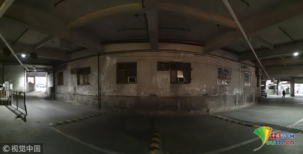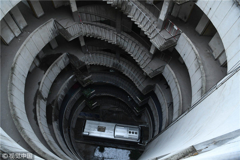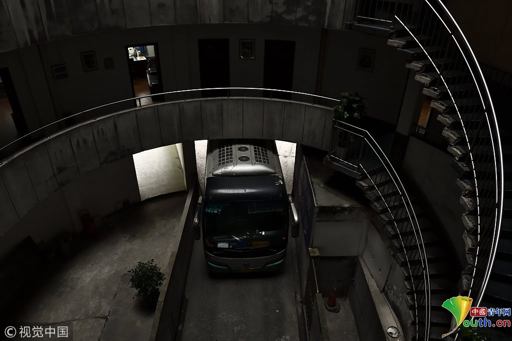 2018年12月6日,重慶江北紅旗河溝汽車站內,有一棟獨特的八層圓環(huán)狀建筑,底層每天有不少進出站的客車通行。據(jù)悉,這棟樓建于1990年,曾經(jīng)是車站旅館,如今一、二兩層用于車站辦公,其余樓層已廢棄。為確保安全,三層以上已經(jīng)被封鎖。圖為公交車穿過8層空心圓筒樓。徐勇/視覺中國
