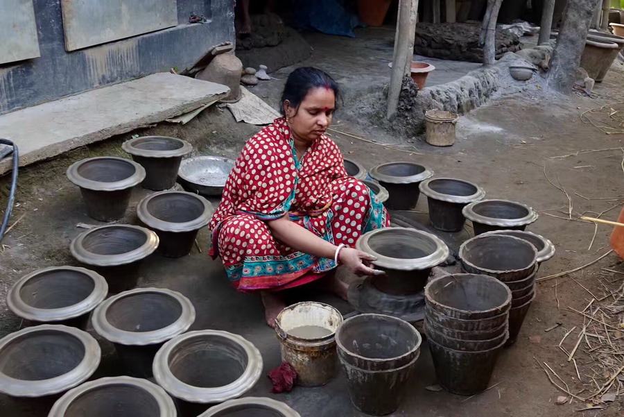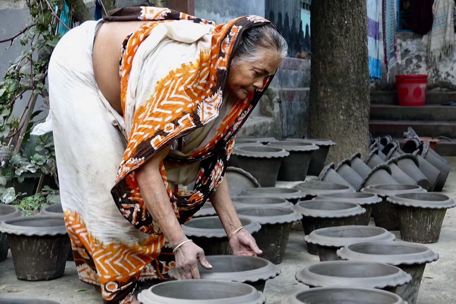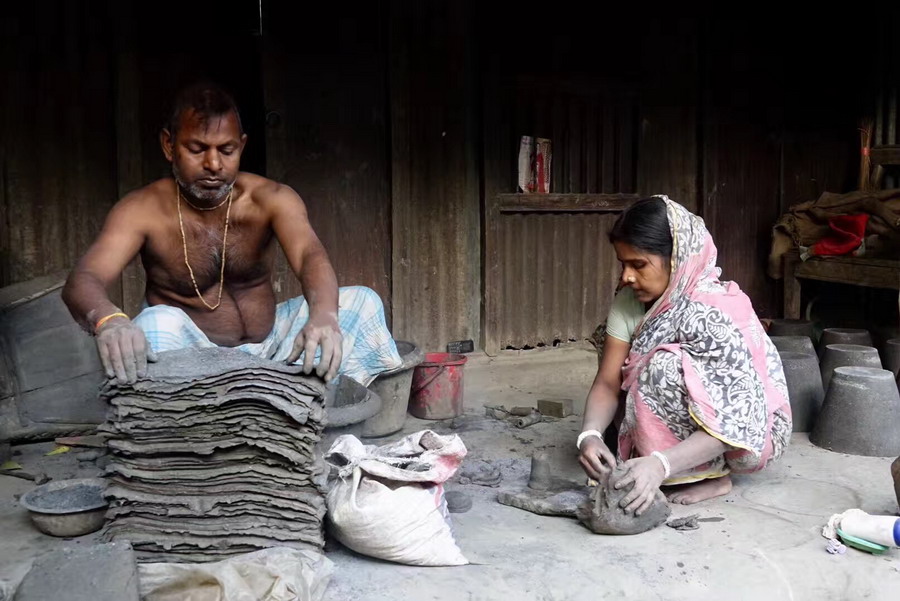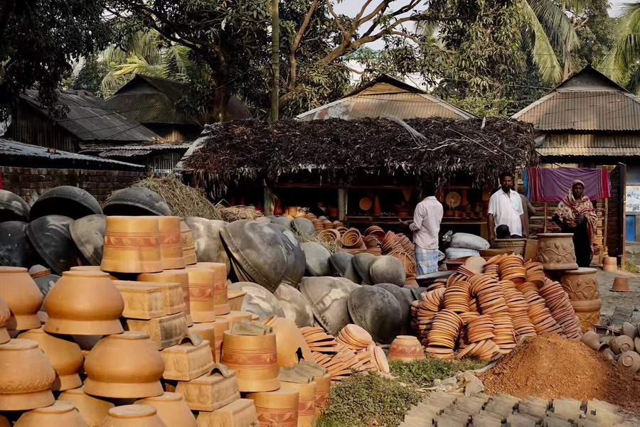 達(dá)卡遠(yuǎn)郊區(qū)一個(gè)印度教徒聚居的村莊,幾乎家家戶戶都開辦制陶作坊,以傳統(tǒng)工藝制作陶盆、陶罐、陶盤和建筑裝飾陶器,遠(yuǎn)銷孟加拉國內(nèi)各地。李仁奇 攝