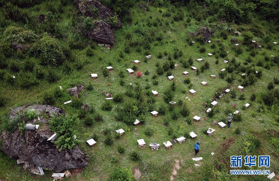5月10日,在甘肅省隴南市徽縣大河店鎮(zhèn)硬灣村,蜂農(nóng)查看蜂箱情況(無人機拍攝)。 甘肅省隴南市徽縣大河店鎮(zhèn)硬灣村位于秦巴山區(qū)深處,2017年,在當?shù)卣姆龀窒拢堁吕铣裁垧B(yǎng)殖農(nóng)民專業(yè)合作社成立,蜂農(nóng)們將傳統(tǒng)養(yǎng)蜂技藝和現(xiàn)代加工方式相結(jié)合,并通過電商等渠道打開銷路,有效帶動了當?shù)刎毨Т迕衩撠氈赂弧D壳罢麄€合作社共有蜂箱2000余個,每箱每年可帶來三四千元的收入。 新華社記者 馬寧 攝