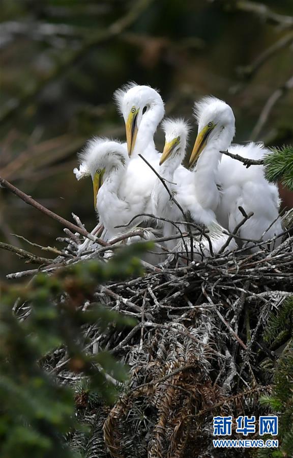江西省南昌市新建區(qū)象山森林公園內(nèi)的白鷺雛鳥(niǎo)(5月21日攝)。 近日,在江西省南昌市新建區(qū)象山森林公園內(nèi),已安家筑巢的大批鷺鳥(niǎo)陸續(xù)孵化出了后代。象山森林公園有著“鷺鳥(niǎo)王國(guó)”的美譽(yù),生態(tài)環(huán)境良好,每年都會(huì)吸引白鷺、蒼鷺、夜鷺等種類的鷺鳥(niǎo)飛抵棲息和繁衍后代。 新華社記者 彭昭之 攝