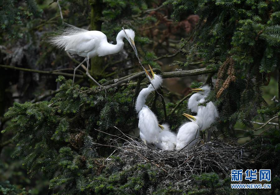 在江西省南昌市新建區(qū)象山森林公園內(nèi),白鷺和自己的雛鳥在一起(5月21日攝)。 近日,在江西省南昌市新建區(qū)象山森林公園內(nèi),已安家筑巢的大批鷺鳥陸續(xù)孵化出了后代。象山森林公園有著“鷺鳥王國”的美譽(yù),生態(tài)環(huán)境良好,每年都會吸引白鷺、蒼鷺、夜鷺等種類的鷺鳥飛抵棲息和繁衍后代。 新華社記者 彭昭之 攝