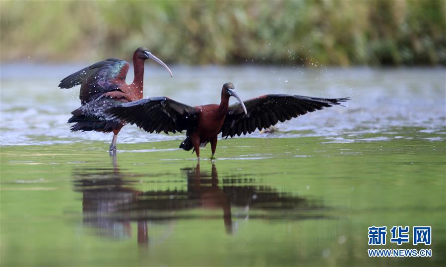 這是在漢江濕地公園嬉水的2只彩鹮(5月4日攝)。 近日,國家二級保護動物彩鹮現身陜西省漢中市漢江濕地公園濂水河與漢江交匯處。 據陜西師范大學生命科學院教授于曉平介紹,彩鹮在世界上的分布比朱鹮還要少,這幾年在云南發(fā)現得多一些,這3只彩鹮現身漢江濂水河畔,是陜西首次發(fā)現彩鹮蹤跡。 據了解,彩鹮是國家二級保護動物,屬鵜形目鹮科,體羽大部為青銅栗色,是珍稀鳥類朱鹮的“近親”,體型比朱鹮略小。 新華社發(fā)
