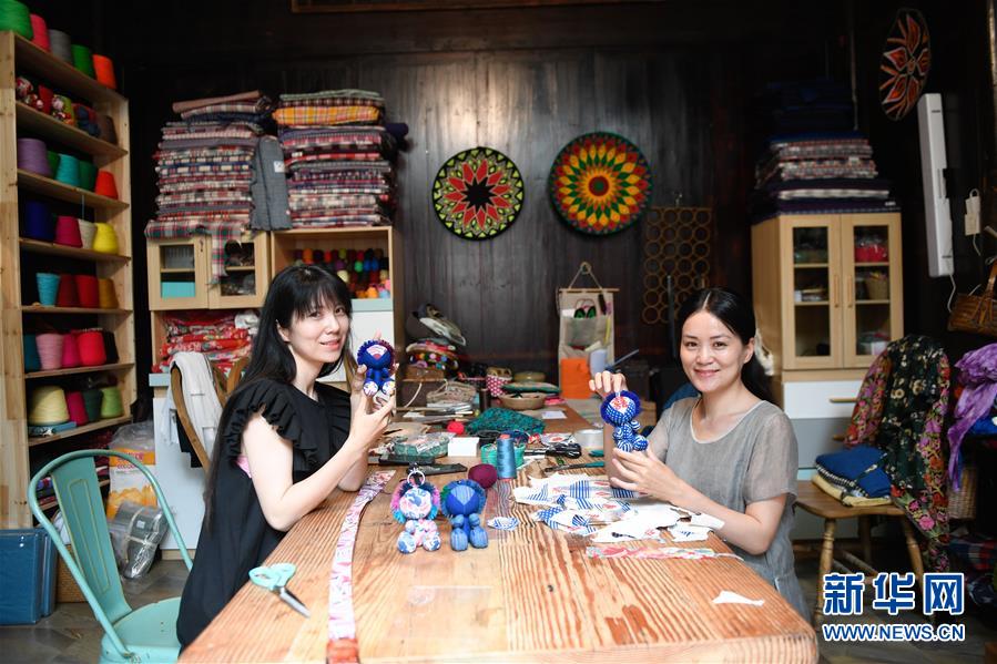 5月26日,在石舍村共同經營“三只蝸?!笔止に嚻飞痰旰涂蜅5慕忝藐愖袭嫞ㄓ遥?、陳莫寒在展示制作的手工藝品。 石舍村是浙江省桐廬縣富春江鄉(xiāng)村慢生活體驗區(qū)中的三個村落之一,位置偏僻,依溪而居,風景秀美。近年來,石舍村結合古建筑保護工作,在清潔、美化村莊的基礎上,對一些廢棄古建筑進行修繕,引入咖啡館、民宿等文化創(chuàng)意類項目,優(yōu)良的生態(tài)環(huán)境和濃郁的文化氛圍吸引大批游客前來體驗,小山村走上了一條發(fā)展美麗經濟之路。2018年,石舍村接待游客10萬8千余人次,旅游經營凈收入1260余萬元。 新華社記者 黃宗治 攝
