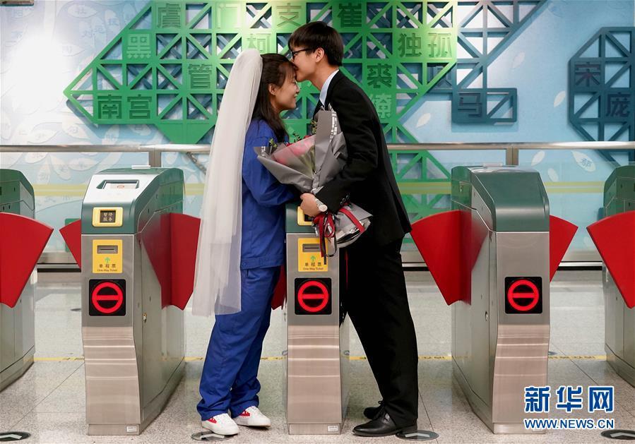 5月20日,兩名參與地鐵5號(hào)線建設(shè)的工作人員在求婚后拍照留念。 當(dāng)日,鄭州地鐵5號(hào)線開始初期運(yùn)營。作為鄭州軌道交通線網(wǎng)中首條環(huán)線,5號(hào)線全長(zhǎng)40余公里,設(shè)站32座。 新華社記者李安攝