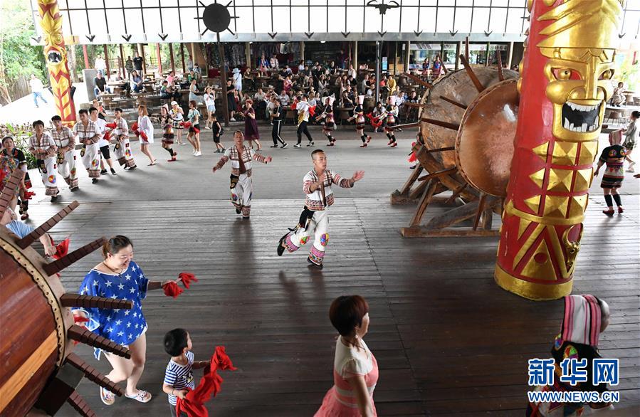 游客與基諾族大鼓舞演員一起跳舞(6月1日攝)。 在云南省西雙版納傣族自治州景洪市基諾山基諾族鄉(xiāng)的基諾族村寨,每天的基諾大鼓舞表演吸引了眾多游客前來(lái)觀賞體驗(yàn),帶動(dòng)了基諾族群眾就業(yè)和增收?;Z族大鼓舞蘊(yùn)涵豐富的歷史文化內(nèi)涵,已被列入國(guó)家級(jí)非物質(zhì)文化遺產(chǎn)保護(hù)名錄。 新華社記者 楊宗友 攝
