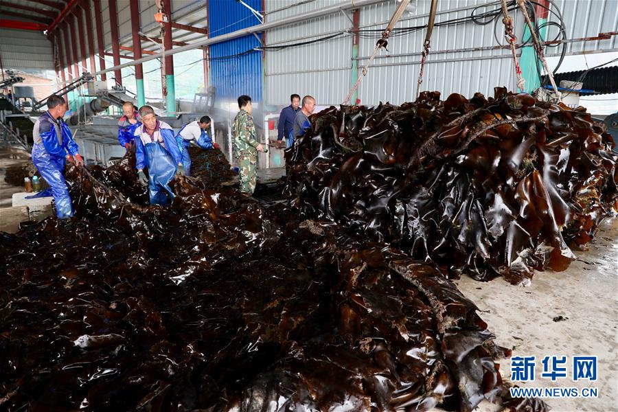 6月5日,在榮成市尋山街道青魚灘村,漁民在加工剛收獲的海帶。 近日,山東省榮成市迎來海帶收獲季。據(jù)悉,榮成市海帶養(yǎng)殖面積14.5萬畝,年產(chǎn)海帶43.3萬噸以上。 新華社記者郭緒雷攝