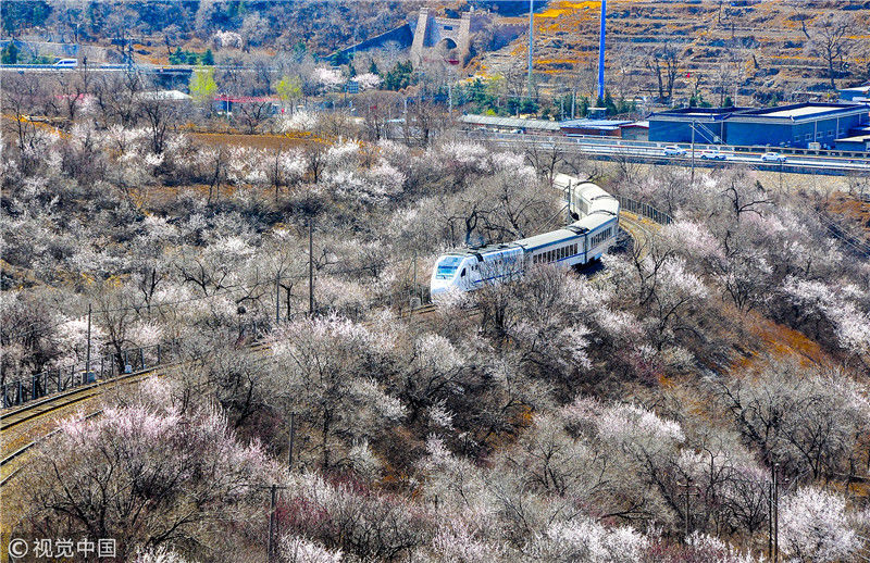 2019年3月22日,北京居庸關(guān)附近的山花盛開(kāi),S2線列車穿行在花海之中,構(gòu)成一幅美麗的畫面。