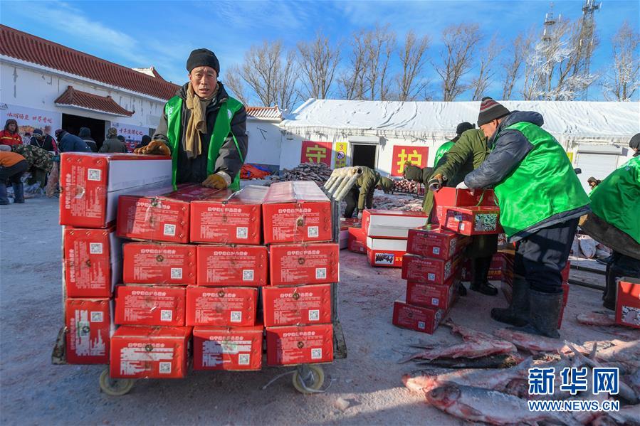 12月27日,在吉林松原查干湖漁場,工人們將魚裝箱。 新華社記者張楠攝