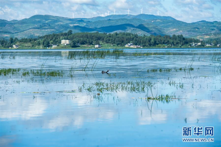 草海國家級自然保護(hù)區(qū),一只白骨頂雞在水面游弋(6月20日攝)。 新華社記者 陶亮 攝
