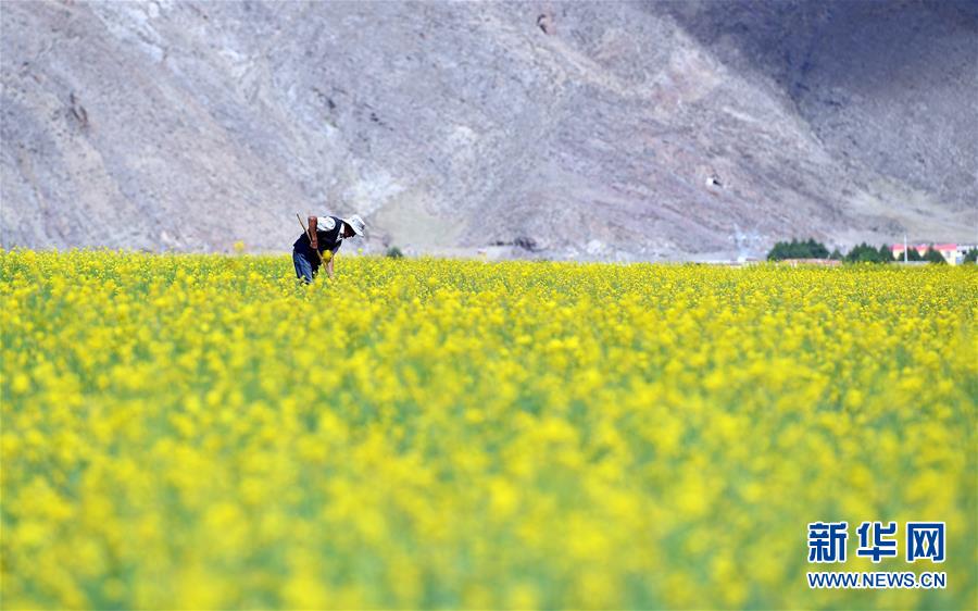 7月2日,拉薩市堆龍德慶區(qū)朗巴鄉(xiāng)村民玉珍在打理油菜花田。 近日,西藏各地的油菜花盛開,呈現(xiàn)出生機勃勃的夏日美景。 新華社記者 晉美多吉 攝