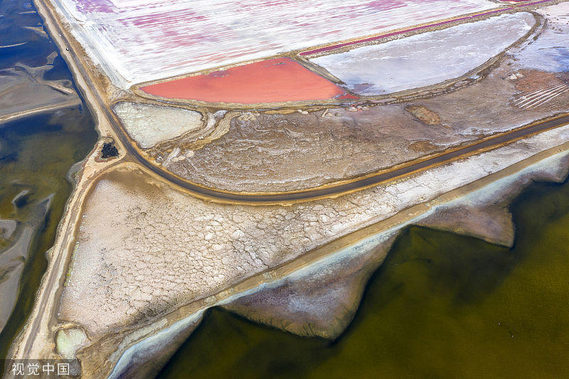 當(dāng)?shù)貢r間2019年6月11日,航拍納米比亞沃爾維斯灣五彩鹽田。鹽田總面積達(dá)3500公頃(35平方千米),南非近90%的鹽都由該地供應(yīng),鹽田中生長的海藻和鹽濃度不同造成鹽田呈現(xiàn)出多種色彩,照片由自由攝影師Franco Cappellari使用無人機(jī)拍攝。