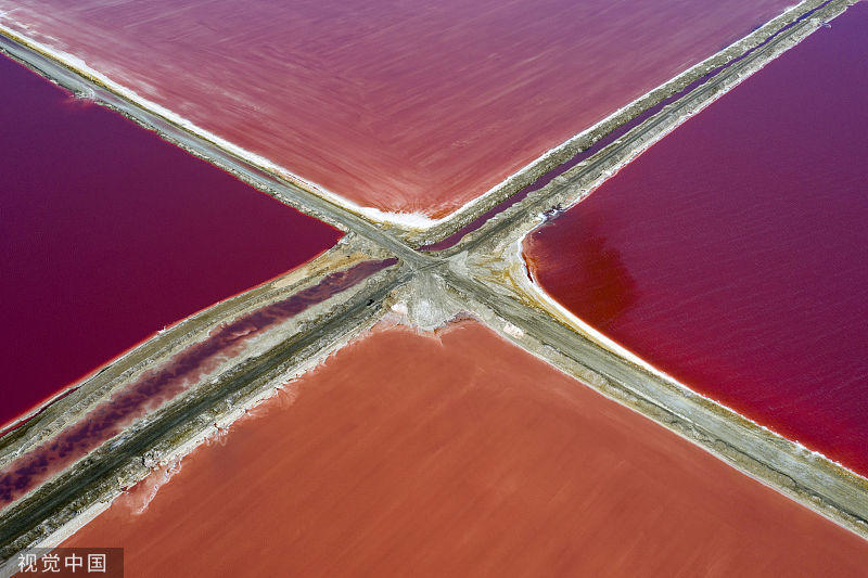 這片俯拍的鹽田總面積達(dá)3500公頃(35平方千米),因為當(dāng)?shù)睾T搴望}的濃度不同造成了鹽田的不同色彩。