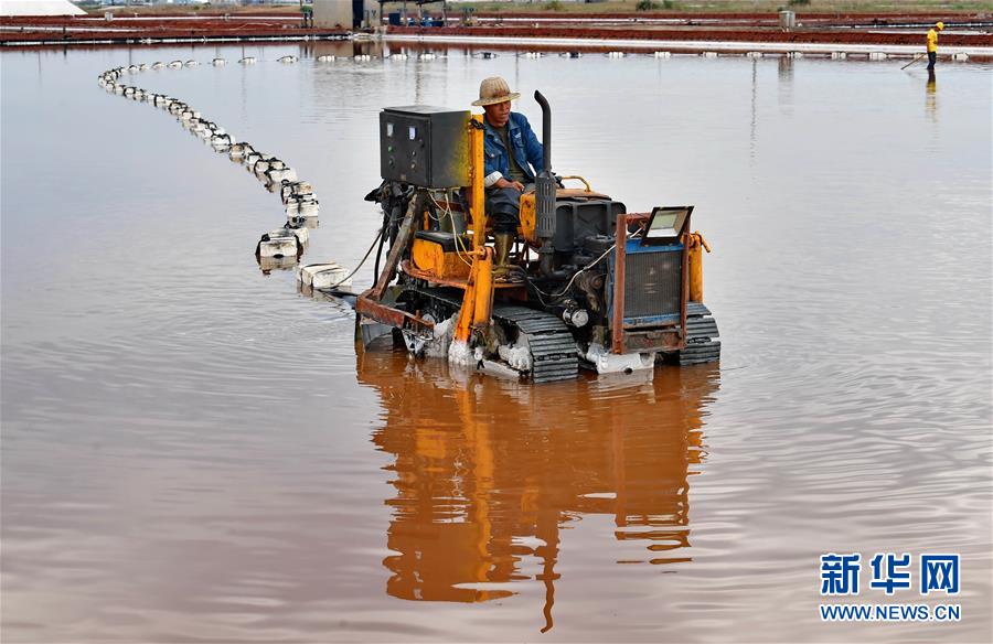 7月3日,唐山海港經(jīng)濟(jì)開發(fā)區(qū)大清河鹽場的工人在洗鹽場工作。新華社記者 楊世堯 攝