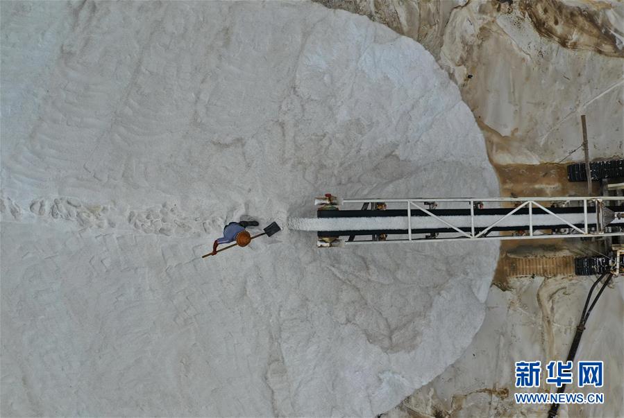 7月3日,唐山海港經(jīng)濟(jì)開發(fā)區(qū)大清河鹽場(chǎng)的工人在鹽堆上工作(無人機(jī)拍攝)。新華社記者 楊世堯 攝