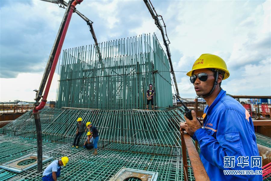 中鐵大橋局施工人員(右一)在湛江調(diào)順跨海大橋東岸主塔墩承臺現(xiàn)場指揮施工(7月6日攝)。 新華社記者 劉大偉 攝