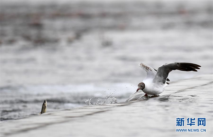 7月6日,在青海省剛察縣沙柳河里,一只棕頭鷗捕捉到一只躍起的湟魚。 新華社記者 吳剛攝