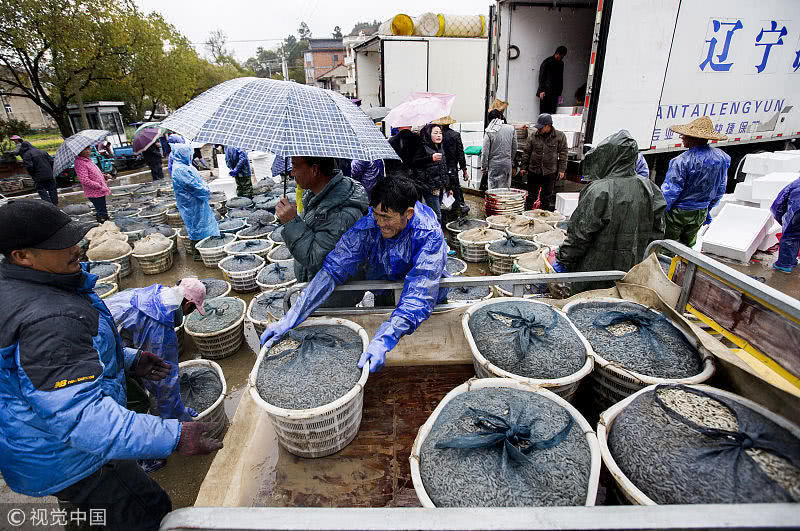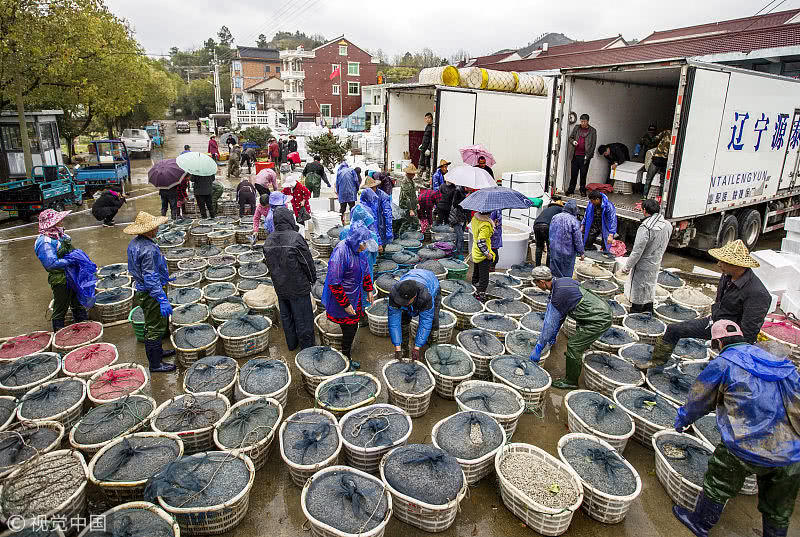 浙江臺州,三門縣花橋鎮(zhèn)柵下村的文化禮堂前,村民們冒雨和商販交易蟶苗,現(xiàn)場一片繁忙。據(jù)了解,花橋蟶苗屬于野生苗,存活率高,易成長,極受市場歡迎,一到捕撈季節(jié),遼寧、山東、江蘇和浙江的養(yǎng)殖戶和蟶苗小販爭相到花橋購買優(yōu)質(zhì)蟶苗。