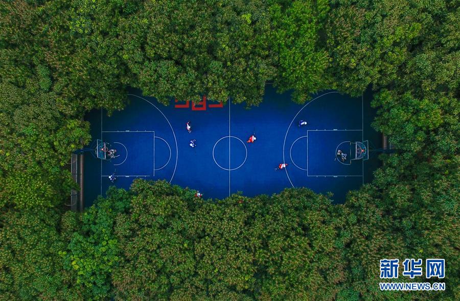 這是被綠蔭環(huán)繞的廣州第四十一中學(xué)運(yùn)動場(2017年3月16日無人機(jī)拍攝)。 新華社記者 劉大偉 攝