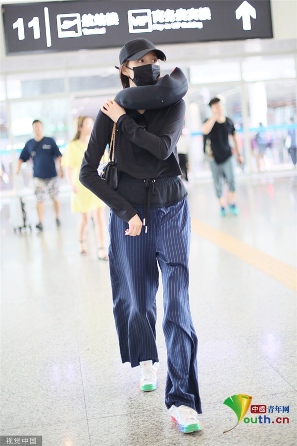 關曉彤淡定抱臂行走 脖子上掛U型枕毫無偶像包袱