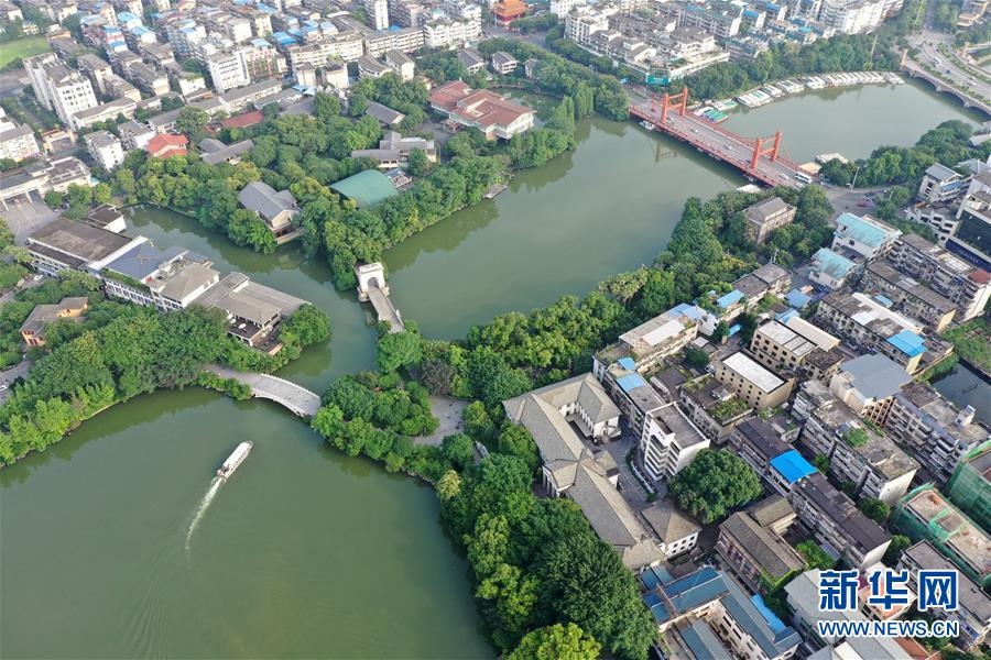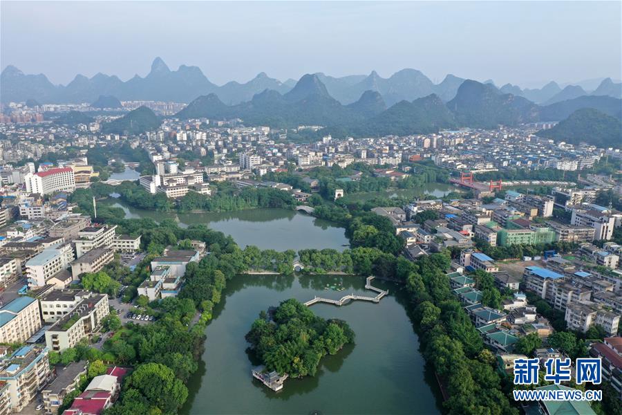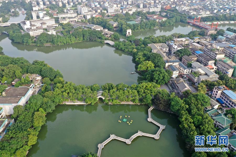 桂林市杉湖景觀(7月1日無人機拍攝)。 夏日時節(jié),廣西桂林市區(qū)內(nèi)的榕湖、杉湖、桂湖、木龍湖等地綠樹成蔭、景色迷人。 新華社記者陸波岸攝