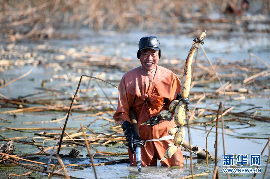 寒冬時節(jié),白洋淀里依然活躍著不少挖藕人,他們身穿橡膠工作服,在冰冷的水中辛勤工作。