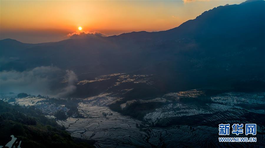 在云南省元陽縣拍攝的晨曦中的哈尼梯田(4月4日無人機(jī)拍攝)。 新華社記者胡超攝
