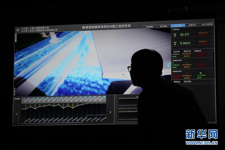 8月27日凌晨,施工人員在監(jiān)控橋梁轉(zhuǎn)體施工。 新華社記者 楊世堯 攝