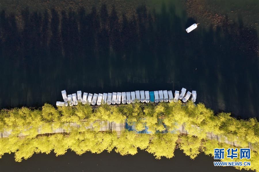游船在白洋淀旅游碼頭內(nèi)行駛(4月10日無人機(jī)拍攝)。新華社記者牟宇攝