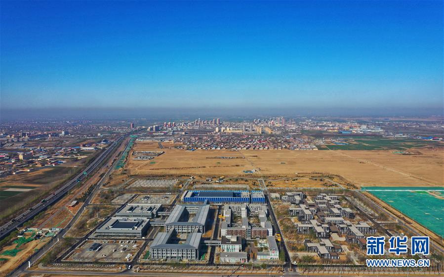 3月31日無人機(jī)拍攝的雄安新區(qū)市民服務(wù)中心(前)遠(yuǎn)處為容城縣城區(qū)。新華社記者牟宇攝