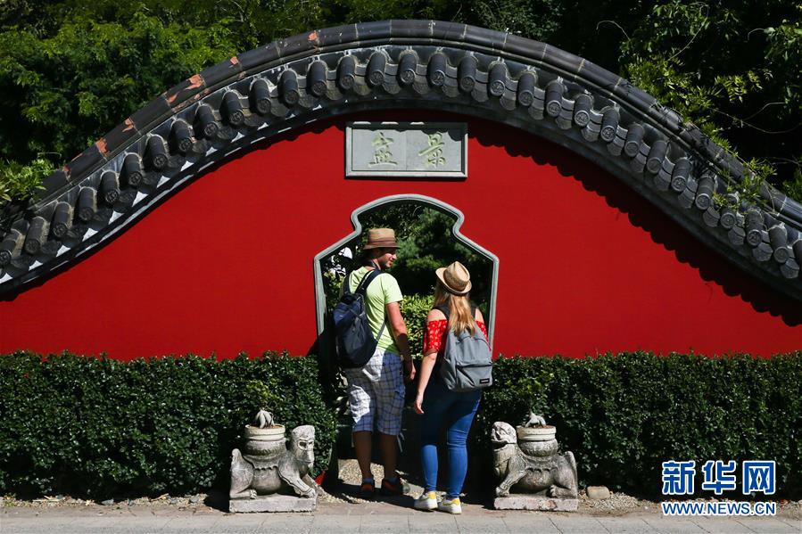 8月24日,在比利時布呂熱萊特市,游客參觀天堂動物園的“中國園”。新華社記者 鄭煥松 攝