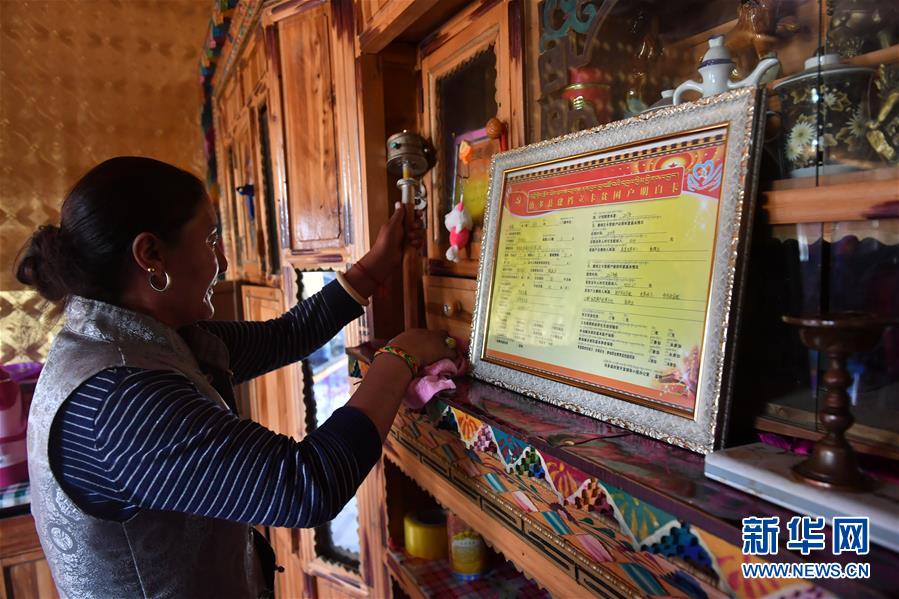 在青海省玉樹(shù)藏族自治州治多縣治渠鄉(xiāng)同卡村,村民昂文西讓的妻子布沙措江卓瑪清理家里的柜子(9月12日攝)。新華社記者 孫瑞博 攝