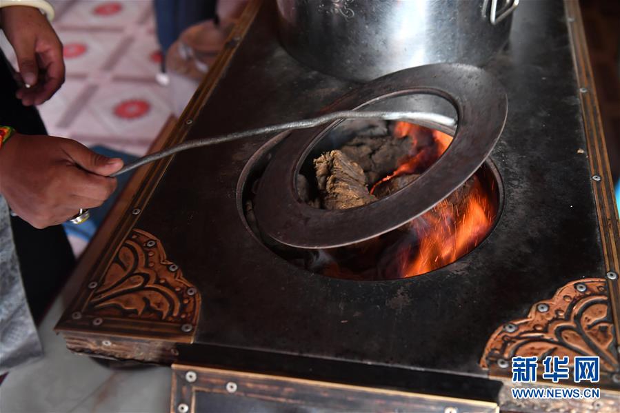 在青海省玉樹(shù)藏族自治州治多縣治渠鄉(xiāng)同卡村,村民布沙措江卓瑪給家中的爐子添加燃料——牛糞(9月12日攝)。在當(dāng)?shù)?,清潔環(huán)保的牛糞依然是不少牧民選用的主要燃料。新華社記者 孫瑞博 攝
