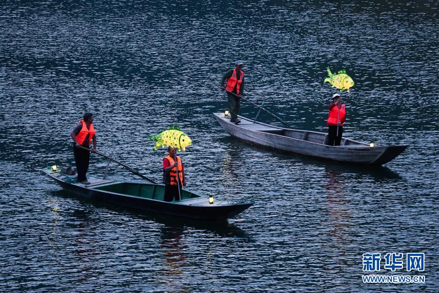 9月25日,在宋村鄉(xiāng)云源港的水面上,漁民劃著漁船,船頭點亮漁燈,構(gòu)成一幅“漁舟唱晚、萬家燈火”的美麗圖景。 新華社記者 徐昱 攝
