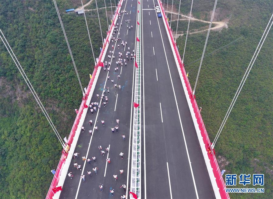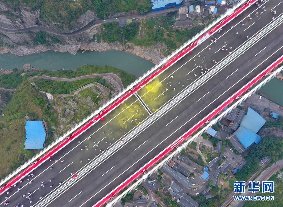 9月30日,赤水河大橋建設(shè)者以一場彩虹跑慶祝大橋建成(無人機(jī)攝)。新華社記者劉坤攝