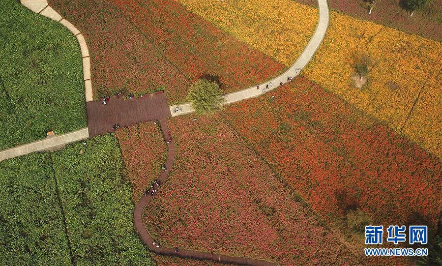 10月9日無人機(jī)拍攝的四季花海城市公園風(fēng)景。 秋日時(shí)節(jié),位于安徽省合肥市的四季花海城市公園花香四溢,色彩繽紛,成為游客和市民休閑游玩的好去處。 新華社記者 張端 攝