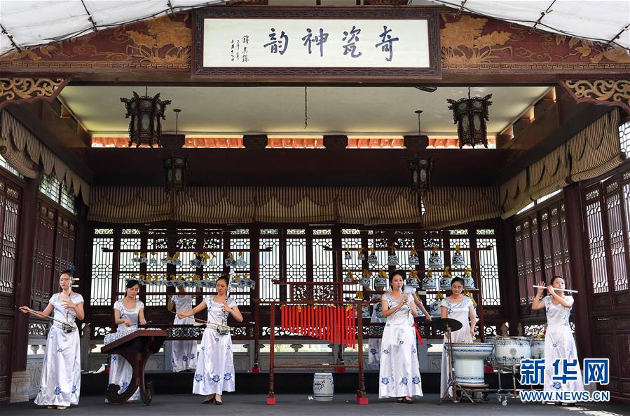 在江西景德鎮(zhèn)古窯民俗博覽區(qū),演員們用瓷制樂器進行“瓷樂”表演(2018年9月20日攝)。新華社記者 萬象 攝