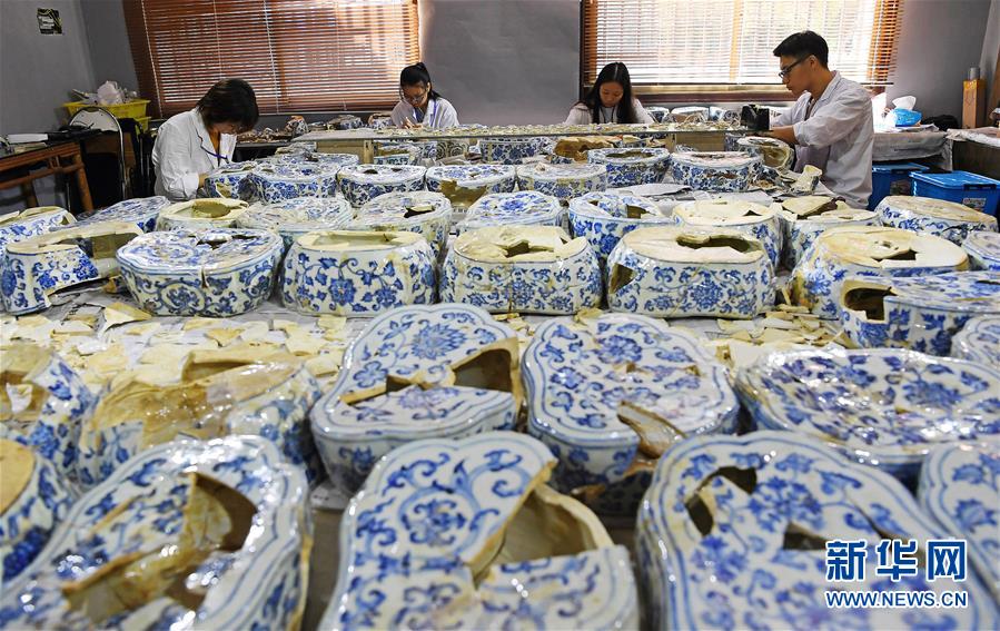 在江西景德鎮(zhèn)御窯廠遺址,工作人員在修復明代瓷枕(2018年9月20日攝)。新華社記者 萬象 攝