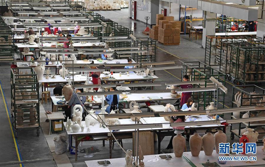 在江西景德鎮(zhèn)法藍瓷實業(yè)有限公司,工人們在陶瓷生產(chǎn)車間工作(2017年4月8日攝)。新華社記者 萬象 攝