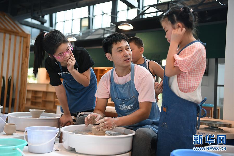 在江西景德鎮(zhèn)陶溪川文創(chuàng)街區(qū)的陶公塾實訓基地,孩子們在老師(中)的指導下制作陶藝作品(7月26日攝)。新華社記者 萬象 攝