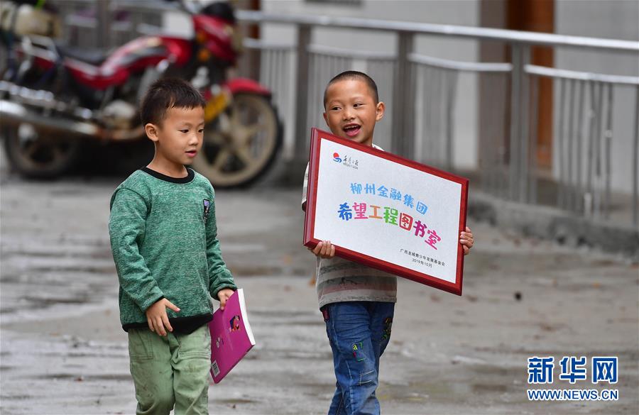 黔桂烏英苗寨的孩子捧著“希望工程圖書室”的牌匾,準備懸掛(10月12日攝)。新華社記者 黃孝邦 攝