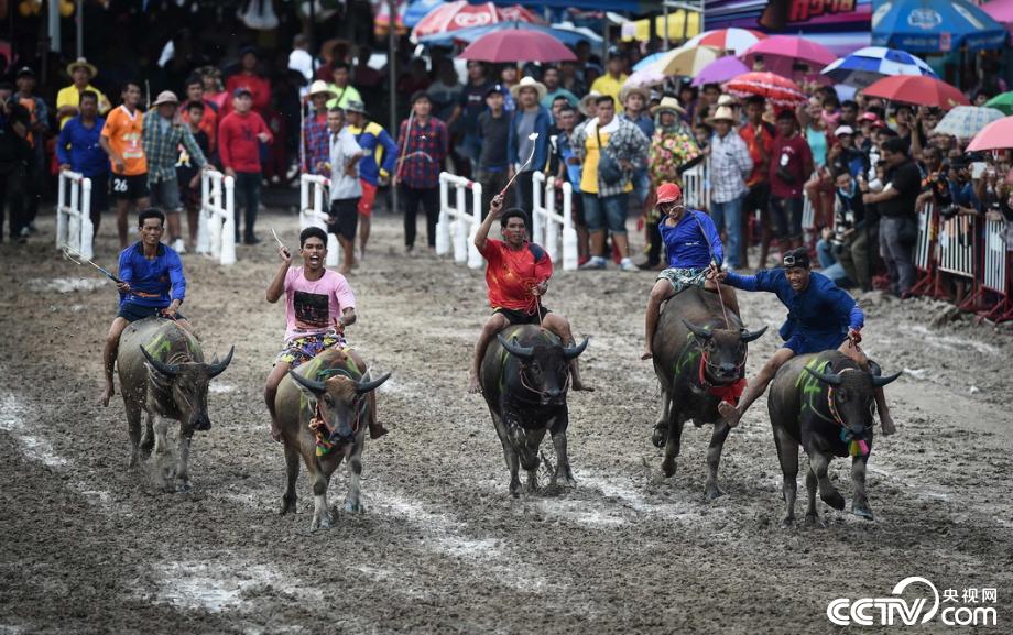 央視網消息:當地時間2019年10月12日,泰國春武里舉行一年一度的水牛賽跑,選手騎??癖?。視覺中國