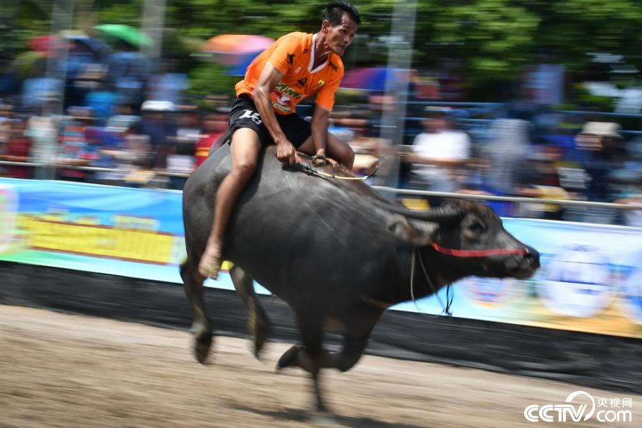 當(dāng)?shù)貢r(shí)間2019年10月12日,泰國春武里舉行一年一度的水牛賽跑,選手騎??癖?。視覺中國