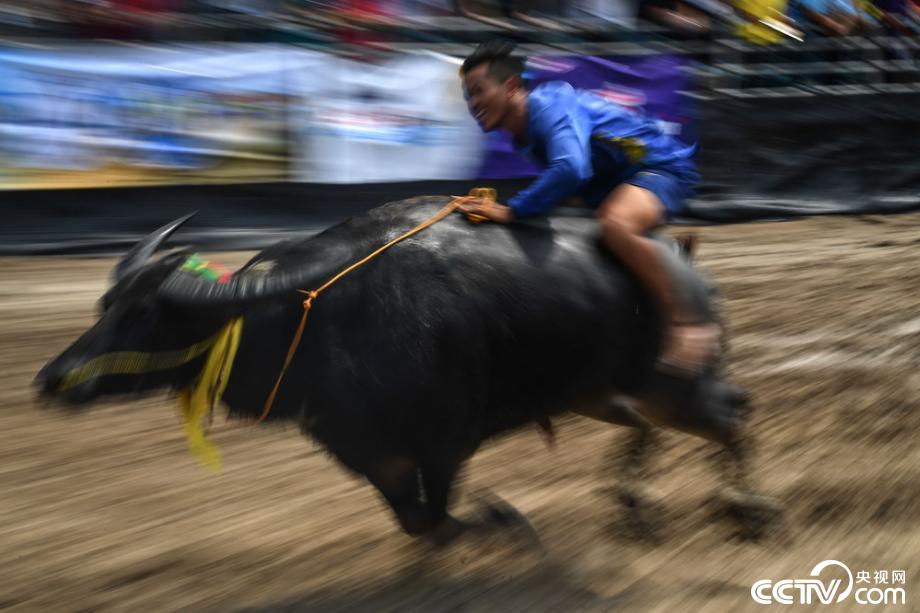 當(dāng)?shù)貢r間2019年10月12日,泰國春武里舉行一年一度的水牛賽跑,選手騎牛狂奔。視覺中國
