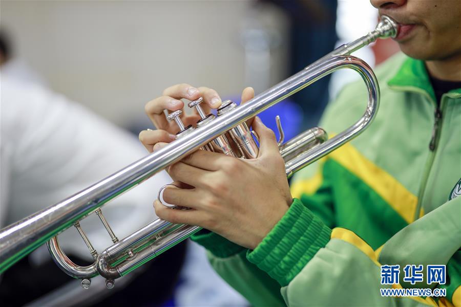 重慶市特殊教育中心排練廳,學生在排練開始前練習小號(10月9日攝)。 新華社記者 劉潺 攝