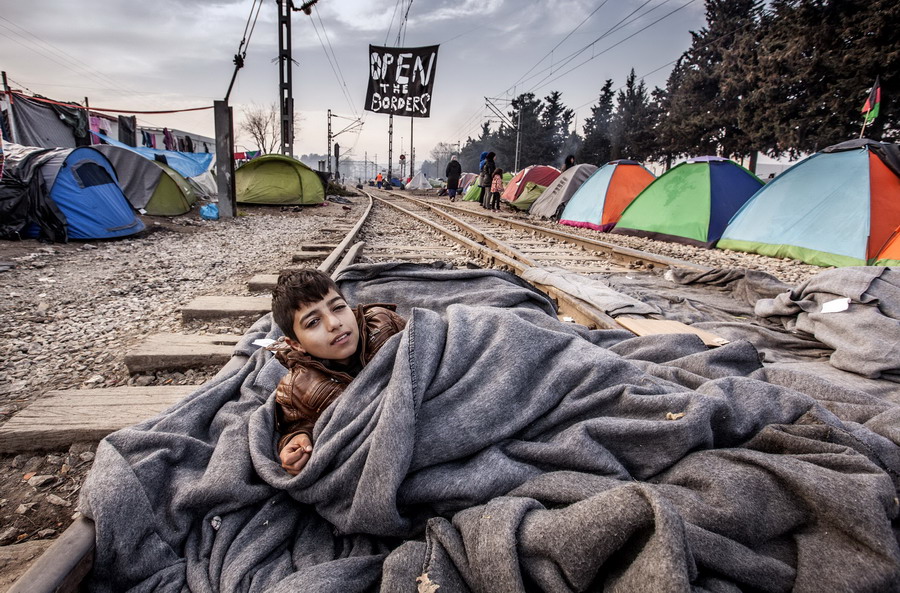 當(dāng)?shù)貢r(shí)間2016年3月22日,希臘伊多梅尼,來(lái)自敘利亞阿勒頗的難民男孩躺在鐵軌上睡覺(jué)。